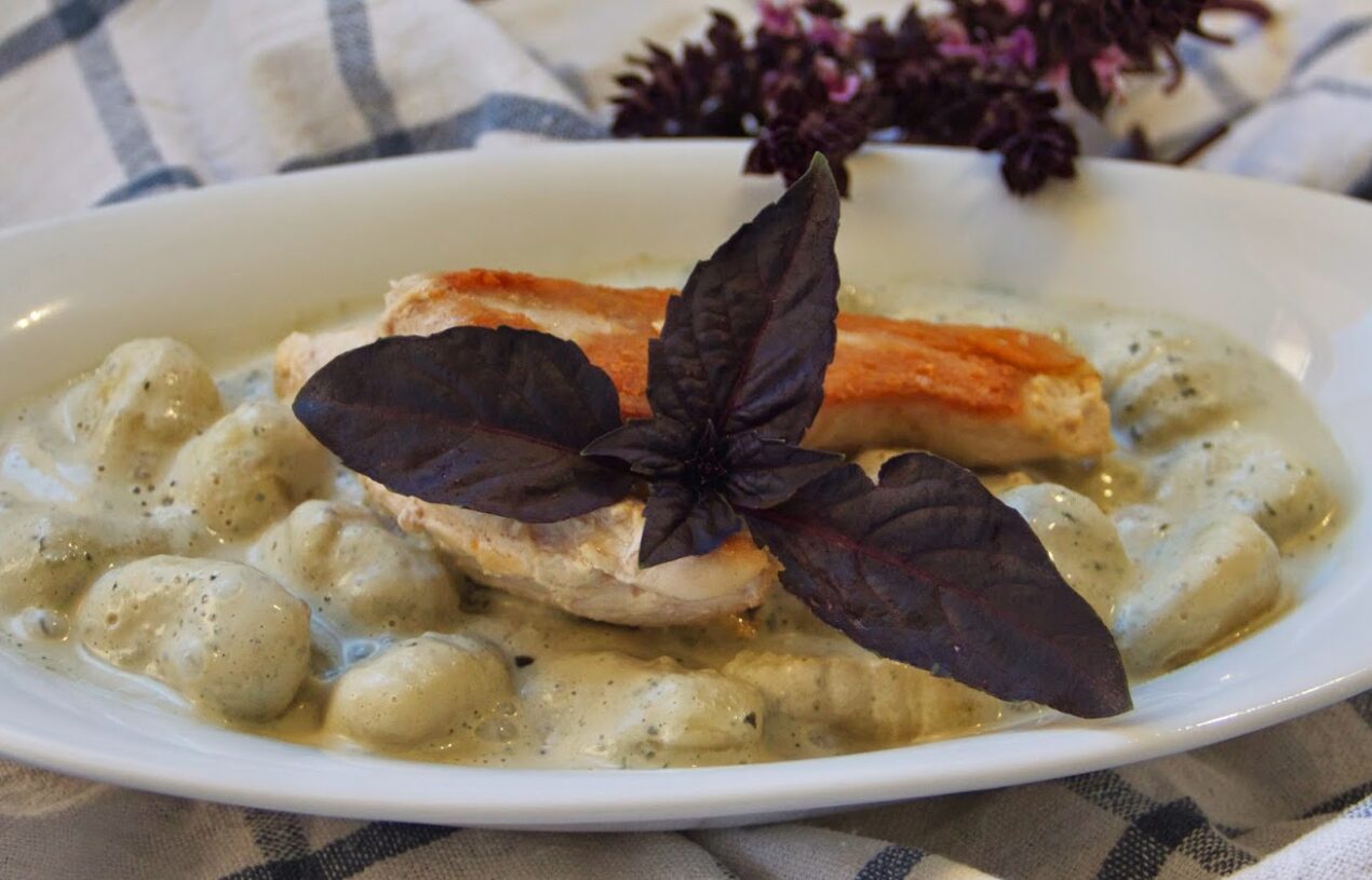 Servir les gnocchis dans des assiettes creusent avec la sauce au basilic et les blancs de poulet poser sur le dessus, décorer de basilic pourpre.