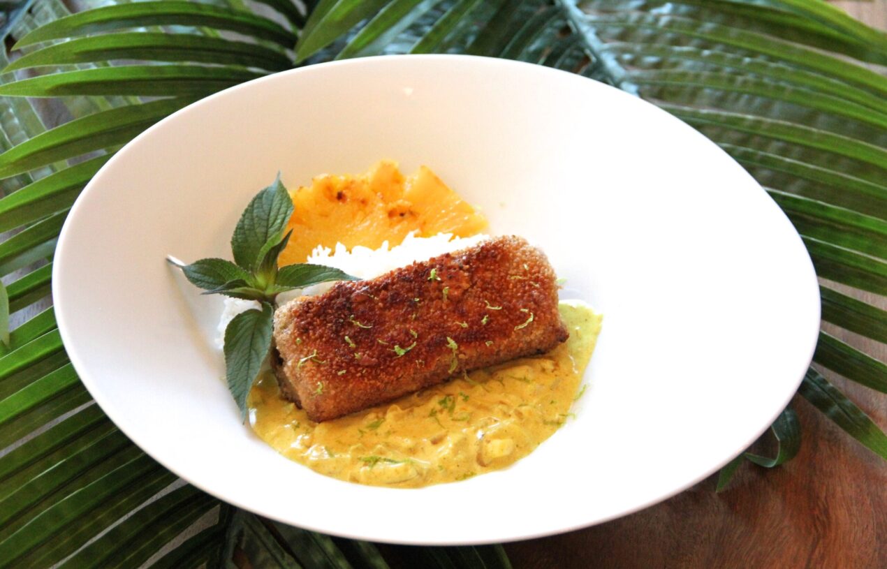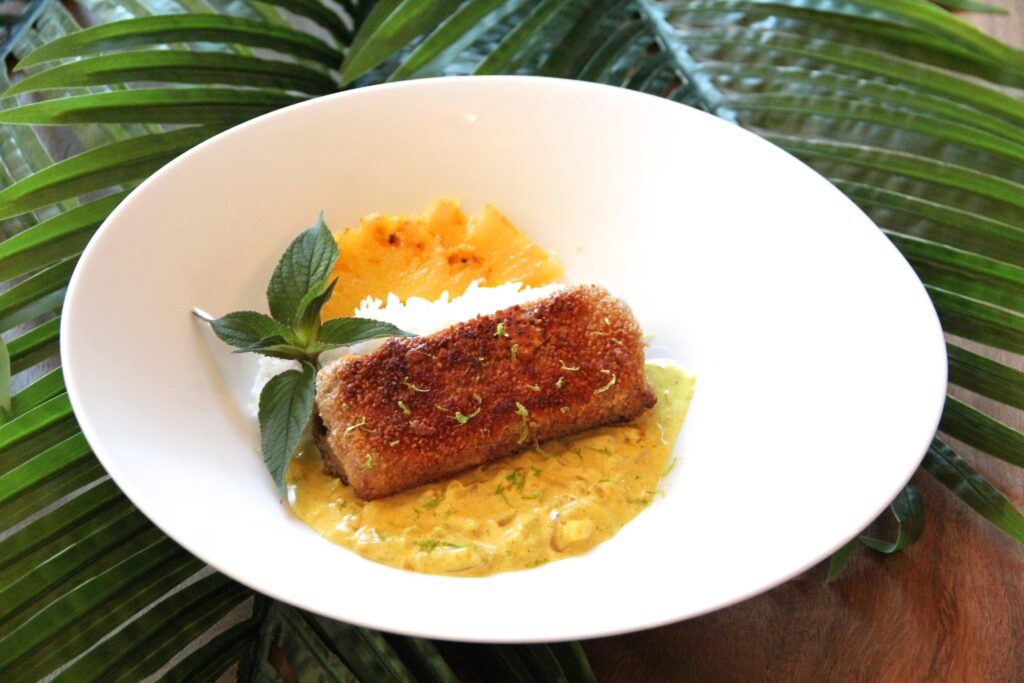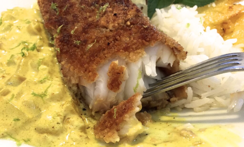Dos de cabillaud pané, sauce curry-ananas-coco (recette à venir)