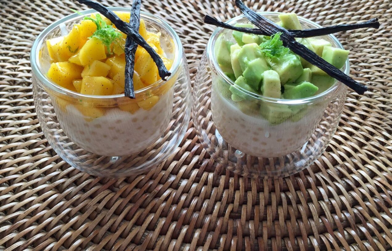 Perles de tapioca au lait de coco, tartare de mangue ou d’avocat à la vanille